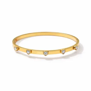 Designed for lovers of refined elegance, this gold bangle reflects the essence of minimal jewellery in Dubai. The sleek band is adorned with delicately set heart-shaped stones that add a soft sparkle while maintaining a clean, modern aesthetic. Its polished finish and understated design make it a versatile piece that complements both contemporary and traditional styles.